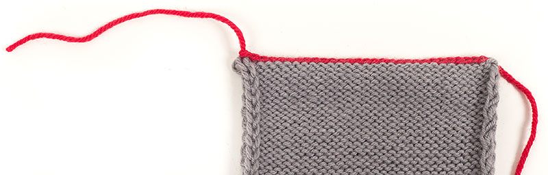 1. Mit der Nadelspitze der Hilfsnadel nacheinander jeweils in die erste Masche der vorderen und der hinteren Nadel wie zum Rechtsstricken einstechen.