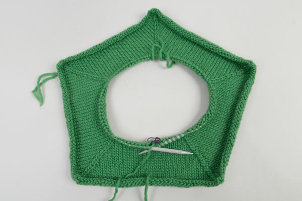 Schlagt in Grün auf der langen Rundstricknd. 200 M an, das sind je Zacken 40 M, schließt die M zur Rd. und markiert fortl. den Rd.-Beginn. Strickt glatt rechts weiter und markiert vor dem Weiterstricken folgende M (= Zackenmitten), gezählt ab Rd.-Beginn: die 21., 61., 101., 141. und die 181. M. Damit Ihr nicht durcheinanderkommt, verwendet Ihr für die Markierung des Rd.-Beginnes einen andersfarbigen M-Markierer. Für die Zackenform beginnt Ihr gleich in der 1. Rd. mit den Abnahmen. Dazu strickt Ihr stets die markierte M mit der M davor und danach so zus., dass die markierte Mittel-M obenauf liegt. Somit nehmt Ihr in dieser Abnahme-Rd. 10 M ab. Diese Abnahmen arbeitet Ihr in jeder 2. Rd., solange bis noch 90 M auf der Nd. liegen (= 18 M je Zacken).