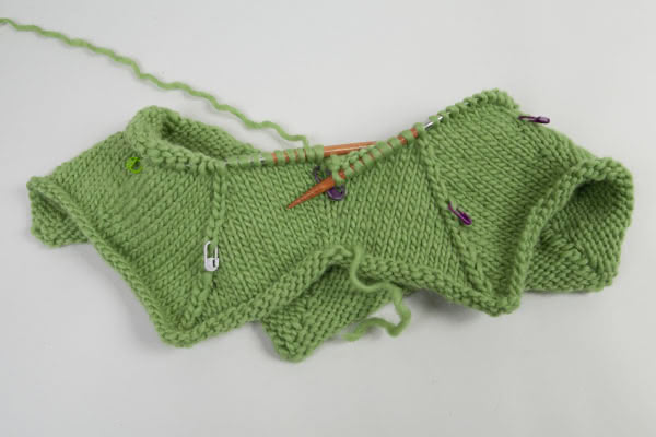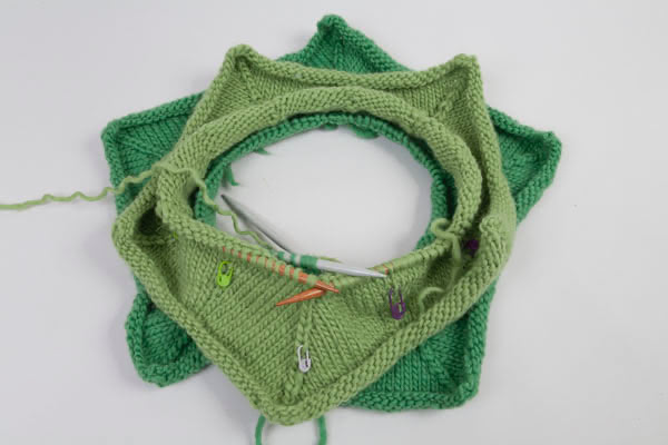 Dann strickt Ihr noch 1 Runde in Hellgrün glatt rechts über die zusammengefügten Teile. In dieser Rd. nehmt Ihr nochmals an den fünf Zunahmestellen beids. je 1 M zu = 20 M/Zacken. Strickt bis zur Mitte des ersten Zackens.