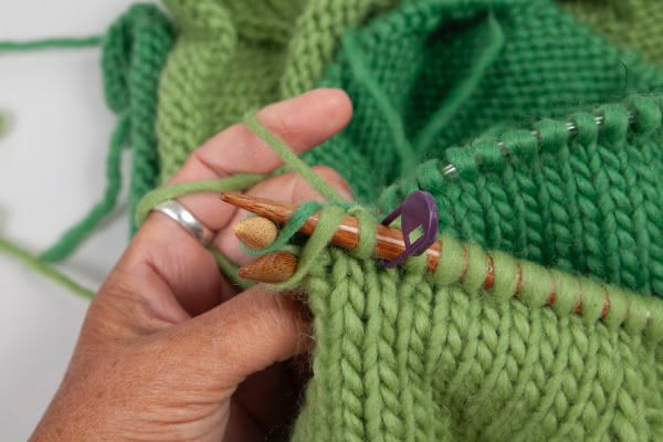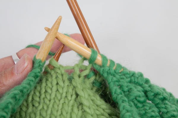 Nun strickt Ihr mit Hellgrün stets eine Masche der vorderen Nadel mit einer Masche der hinteren Nadel rechts zusammen.