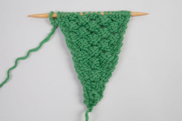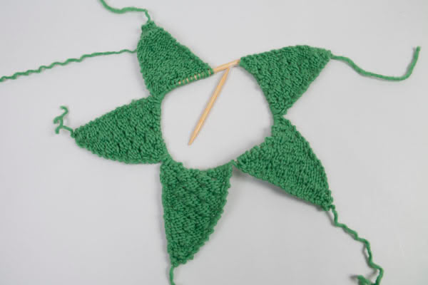 In Grün arbeitet Ihr nun einzelne Zacken. Schlagt dazu 1 Masche an und strickt laut Strickschrift 1 die 1.–29. R. Arbeitet fünf Zacken.