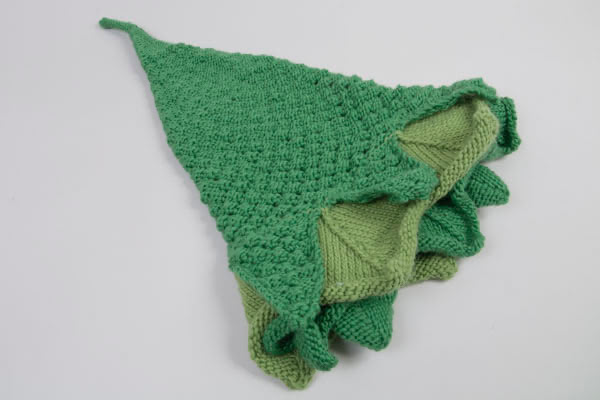 Strickt an der hellgrünen Lage weiter, bis zur Mittelmasche des nächsten Zackens. Die Mittelmasche ist nun die erste Masche auf der linken Nadel. Nun schiebt Ihr die dunkelgrüne Lage in die hellgrüne, so dass die Nadeln genau hintereinanderliegen. Die Zacken beider Lagen sind somit mittig versetzt.