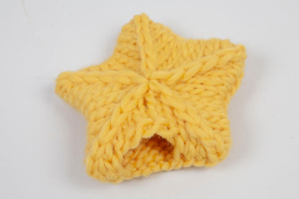 Schließt die M zur Rd. und strickt 1 Rd. re M. Ab hier arbeitet ihr genauso weiter, wie beim 1. Stern. Achtet darauf, dass die Sternspitzen beider Sternhälften genau aufeinandertreffen. Der Stern hat jetzt einen Durchmesser von ca. 10 cm.