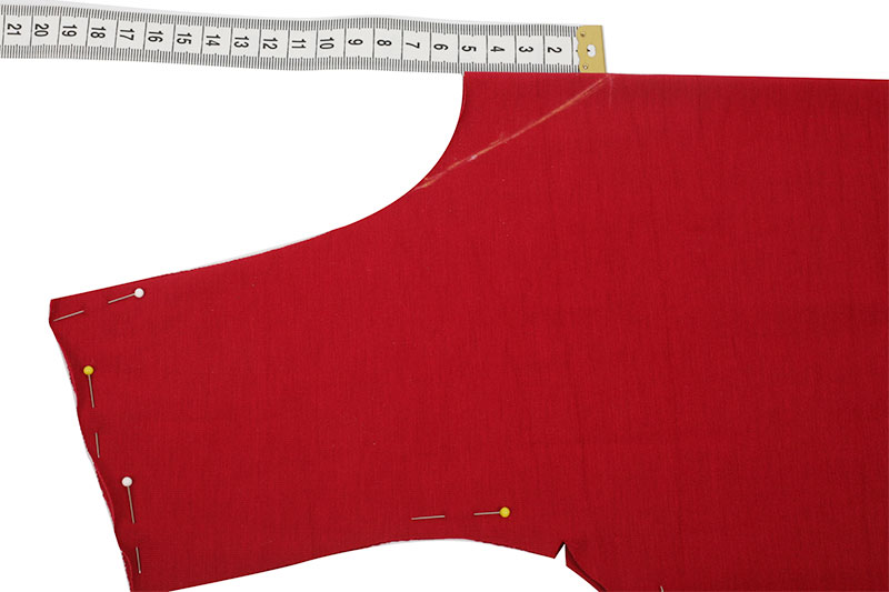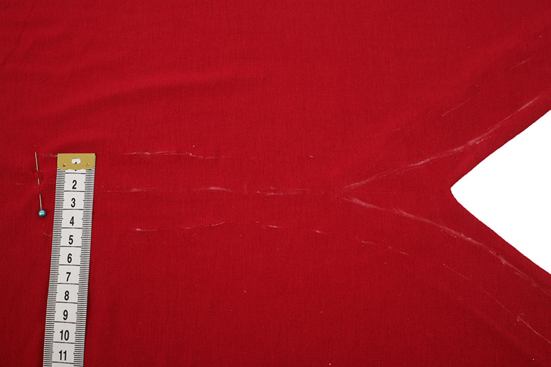 Jetzt geht es schon ans Individualisieren: Am Vorderteil macht Ihr als erstes aus dem Rundhalsausschnitt einen V-Ausschnitt. Dafür messt Ihr am Halsausschnitt im Bruch 5 cm nach unten und zeichnet Euch eine Linie schräg verlaufend zum bestehenden Halsloch mit Schneiderkreide an. Ihr könnt natürlich den Halsausschnitt für Euer Langarm-Shirt je nach Belieben höher oder tiefer setzen, ganz wie es Euch am Besten gefällt.