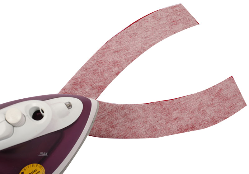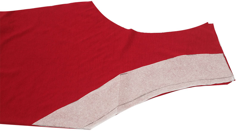 Schneidet den Beleg nun einmal aus Jersey und Vlies zu und bügelt das Vlies auf die linke Belegseite.