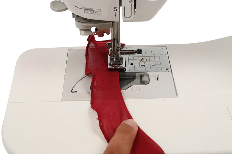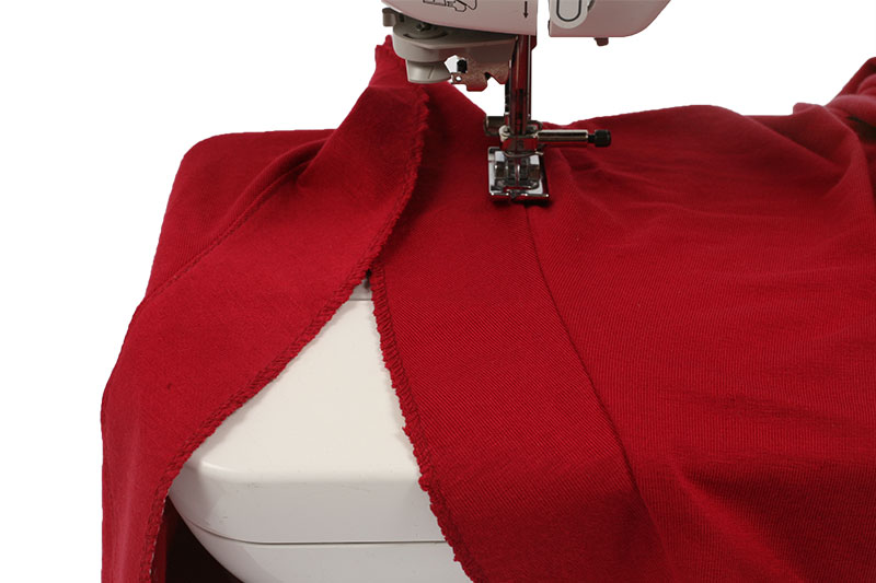 Die offenen Kanten innen und außen werden wie hier entweder schmal nach links umgeschlagen und mit einem engen Zick-Zack-Stich versäubert, oder mit einem Rollsaumfüßchen 2 Mal schmal eingeschlagen.