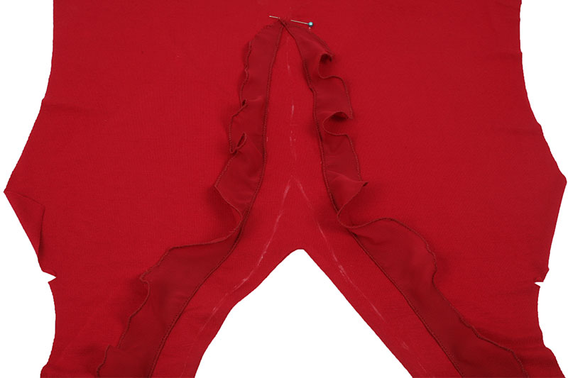 An der eben angezeichneten Linie steppt Ihr Eure erste Volantschnecke an der Innenkante schmal auf. Fangt dabei immer an der Taillenmarkierung an und hört an der Schulter auf. Falls an der Schulter etwas vom Volant übersteht, kann dies einfach zurückgeschnitten werden.