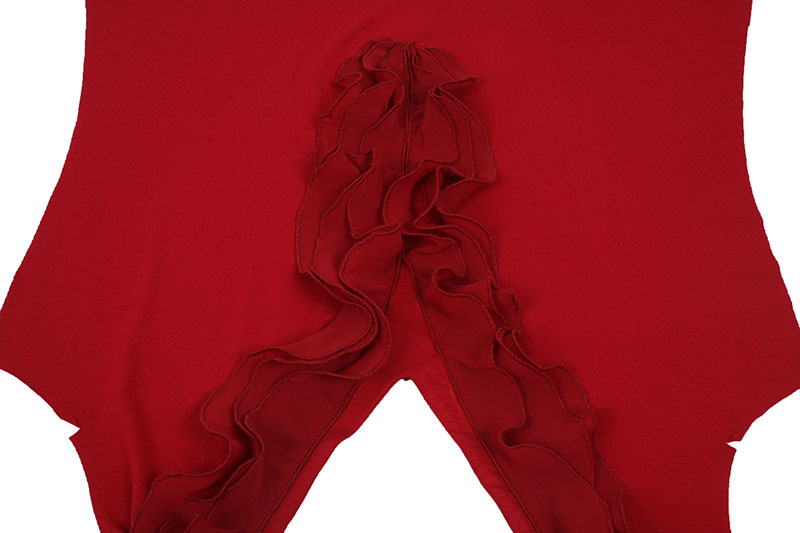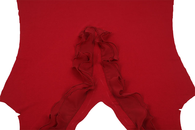 Jetzt nähen wir den Volant. Schneidet dafür 3 Paar Volantschnecken nach der Vorlage aus dem Chiffon zu. Je nachdem, wie groß Euer V-Ausschnitt ist, könnt Ihr oben an der gestrichelten Kante den Volant je nach Größe kürzen oder verlängern.