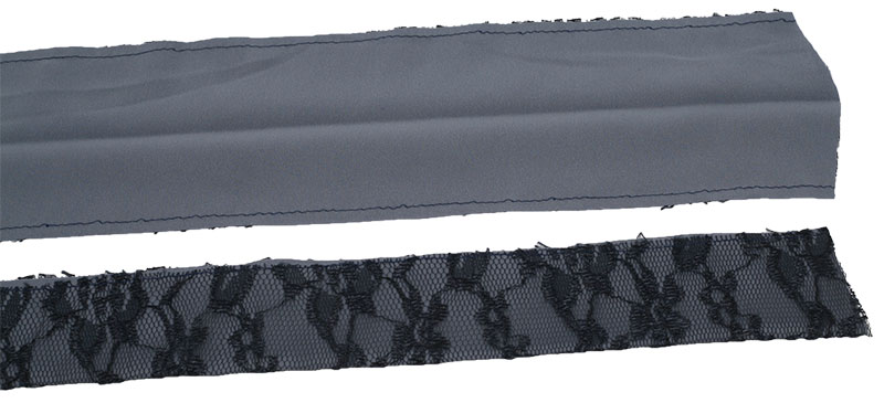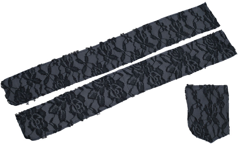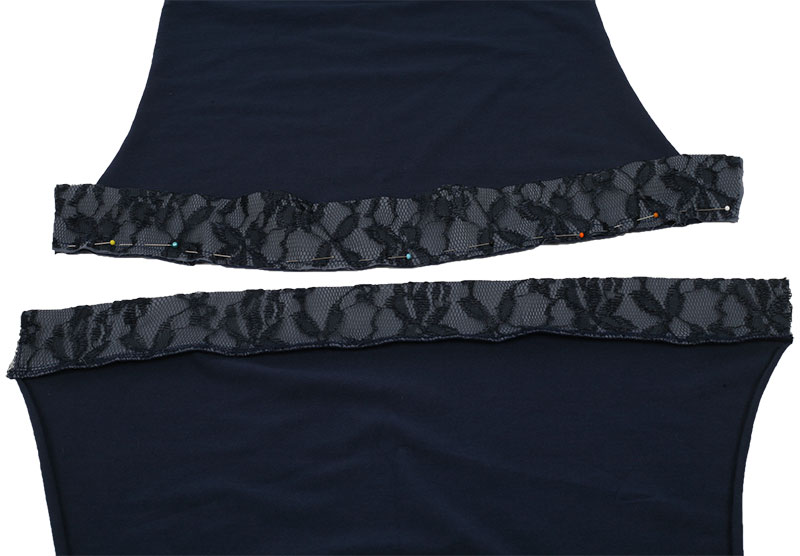 2x Saumblende aus dem Blusenstoff und 2x Saumblende aus Spitze zuschneiden. Alle Teile sind 12 cm hoch, die Breite richtet sich nach den Maßen des Vorderteil- bzw. Rückteilsaumes.