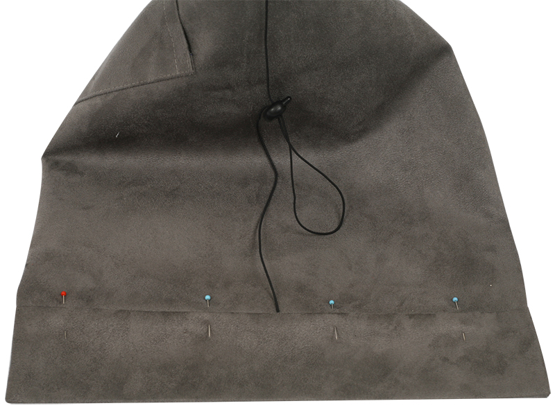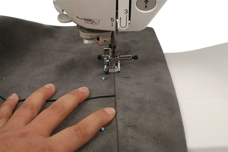 Diese Kante näht Ihr nun mit 1 cm Nahtzugabe zusammen. (die Kordel liegt dabei nun im Bruch auf der linken Seite)
