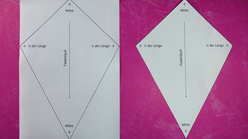 Die Vorlage für die einzelnen Wimpel wird aus einem DIN-A4-Blatt Papier hergestellt. Markiert die Mitte des Papierblattes an den kurzen Seiten und ⅓ der Papierblattlänge an den langen Seiten. Verbindet die vier Punkte miteinander, wie auf dem Foto dargestellt, und schneidet die so entstandene Form aus.