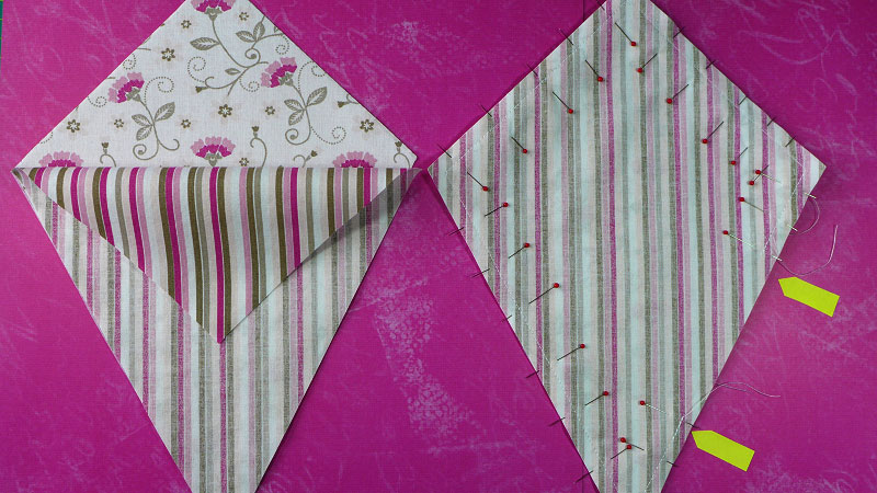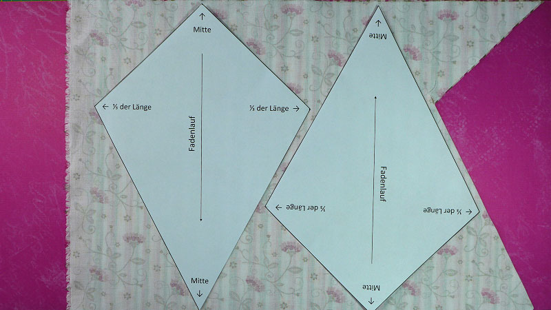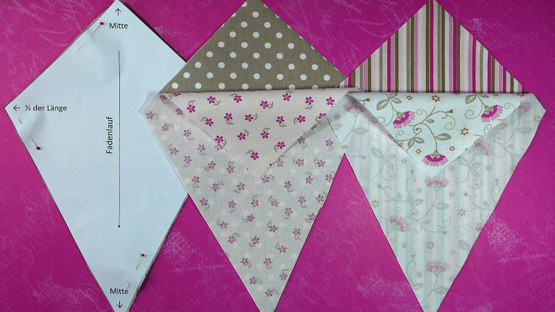 Zwei Stoffabschnitte werden mit der „schönen“ Seite nach innen aufeinander gelegt. Sie bilden die Vorder- und die Rückseite des Wimpels. Die Vorlage wird auf den Stoffen so positioniert, dass der Fadenlauf parallel zu den Stoffkanten verläuft. Die Vorlage wird an die beiden Stofflagen mit Stecknadeln geheftet. Die Nahtzugaben von ca. 0,75 cm sind in der Vorlage bereits berücksichtigt, so dass Ihr direkt entlang den Kanten schneiden könnt.
