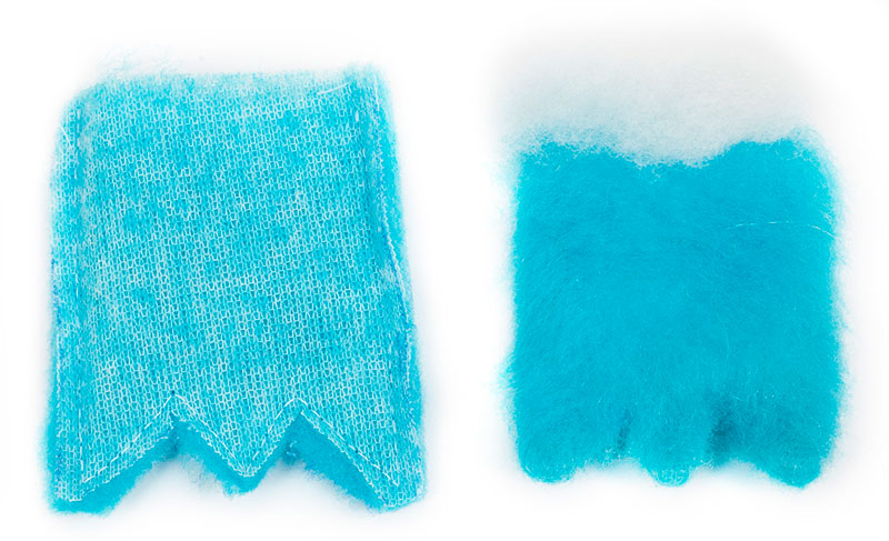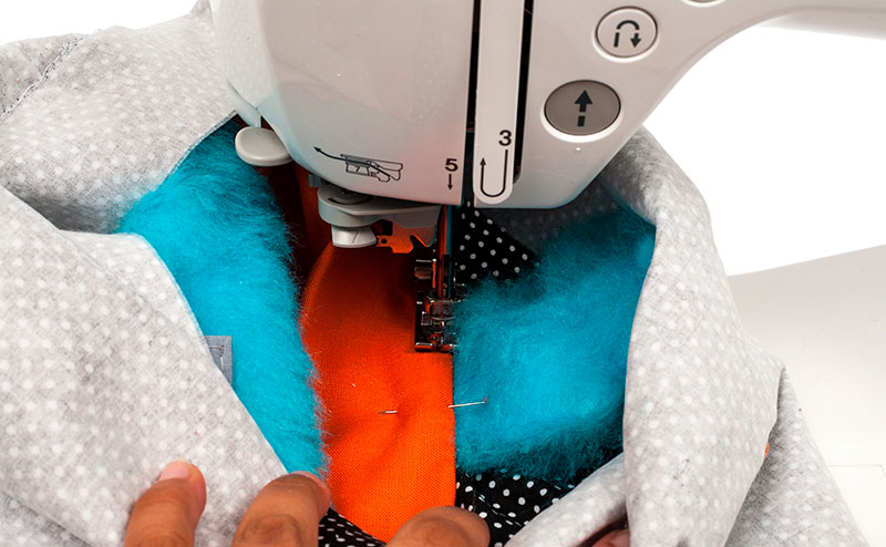 Im Anschluß wendet Ihr die Klappe auf die rechte Stoffseite und füllt sie von oben mit etwas Watte. Näht die offenen Kanten schmalkantig zusammen.