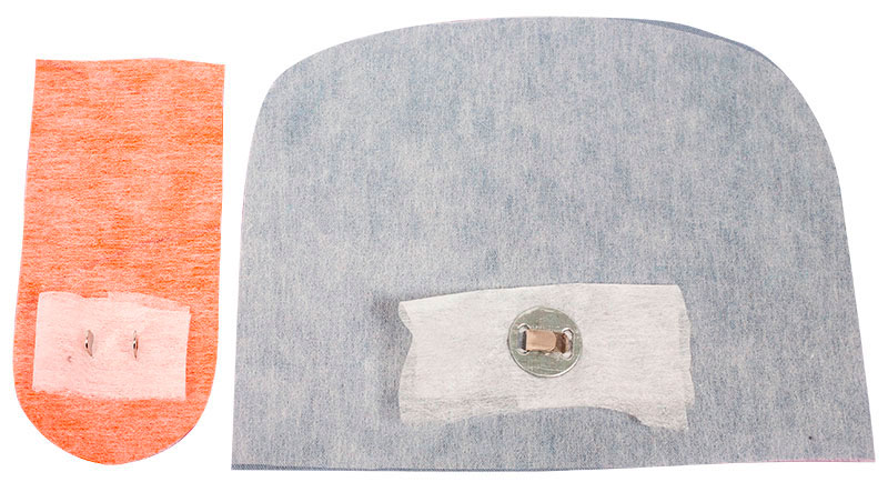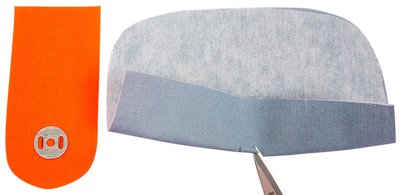 An dem Zungenteil mit Vlieseline legt Ihr auf der rechten Stoffseite von der Rundung bei 2 cm, mittig die Scheibe des Verschlusses auf und markiert Euch die Position der Einschnitte. An der Tasche legt Ihr die Scheibe von der geraden Seite oben bei 2 cm mittig auf und zeichnet die Einschnitte an. Legt Euch einen kleinen Rest vom Vlies als zusätzliche Verstärkung unter und schneidet die Einschnitte durch Stoff und Vließ.