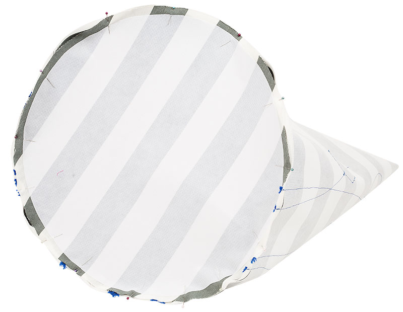 Näht auf dem Kreis, nicht auf dem Schlauch, das ist ein bisschen einfacher. Und weil der Stoff sehr steif ist, steckt Euch lieber eine Nadel zu viel als zu wenig in die Kante.