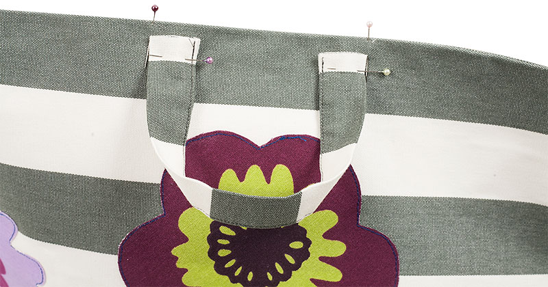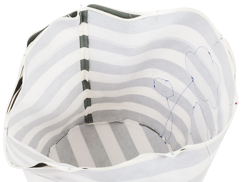 Jetzt näht Ihr die Griffe an: Am Schluss steckt Ihr euch die Griffe an zwei gegenüberliegenden Seiten am Wäschekorb fest.