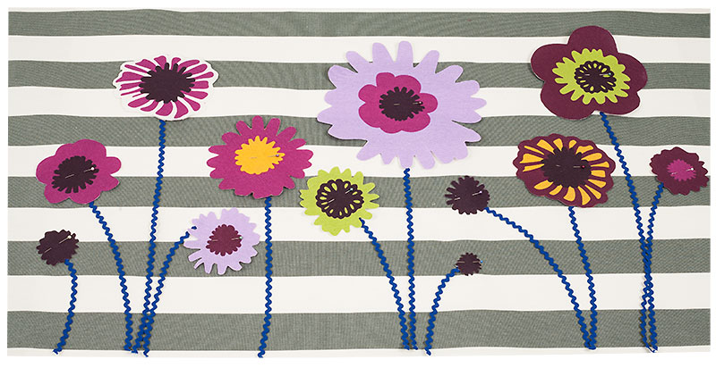 Jetzt könnt Ihr kreativ werden: Ordnet die Blumen auf einem Rechteck so an, wie sie Euch gefallen und schneidet euch aus der Zackenlitze die passenden „Stängel“ zu. Wenn Euch die Anordnung gefällt, fixiert Ihr erst einmal alles mit Stecknadeln.