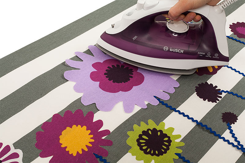 Als nächstes fixiert Ihr die Blumen mit dem Vliesofix auf dem Wäschekorb – die Zackenlitze wird dabei etwas unter die Blume geschoben und gleich mit festgeklebt.