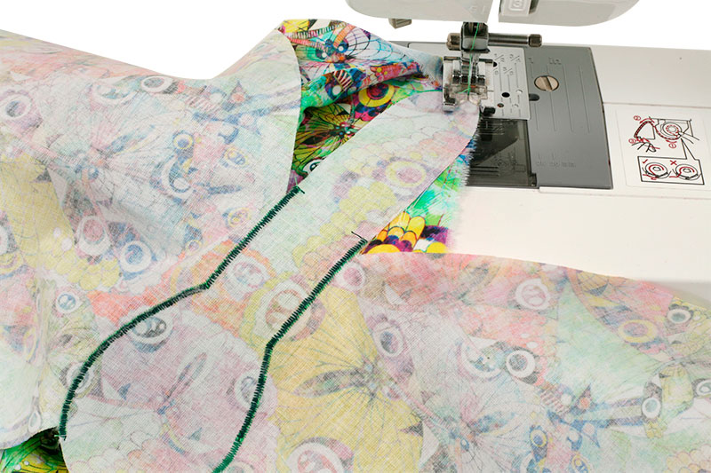 Dann kann es losgehen: Näht jetzt den Streifen am Schmetterling fest. Bei den Eckpunkten oder Kurven lasst Ihr einfach die Nadel im Nähgut stecken und richtet den Stoff für die neue Nährichtung aus. In den Eckpunkten schneidet ihr danach vorsichtig die Nahtzugabe etwas ein, damit sich die Naht nicht verzieht.
