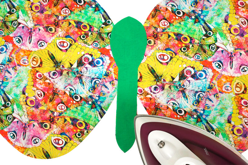 Für den nächsten Schritt braucht Ihr das Stickvlies: Legt das Stickvlies mit der Klebeseite nach oben unter den Schmetterling und bügelt es auf. Jetzt müsst Ihr alle 3 Lagen Material gut fixieren.