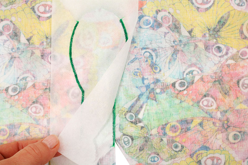 Wiederholt diesen Schritt auch für das andere Kissenteil und zieht das Stickvlies auf der Rückseite der Kissenteile ab.