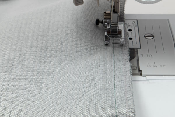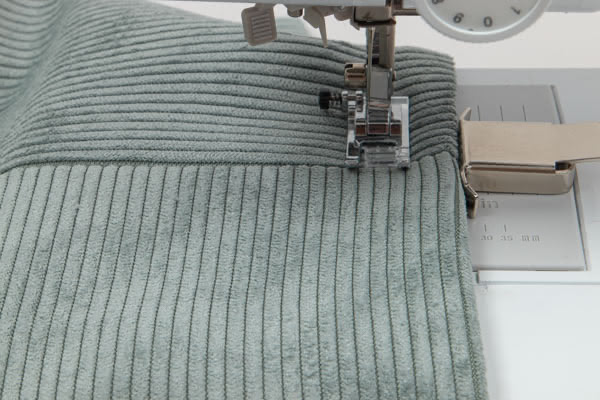 Für den Stehsaum die Naht exakt an die Kante legen und alles gut feststecken, damit nichts verrutschen kann. Anschließend 3cm breit absteppen. Dafür ist die Saumhilfe eine große Erleichterung.
