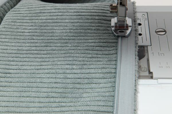 Versäubert am Rückteil oben und Rückteil unten eine lange Kante und legt diese rechts auf rechts zusammen. Näht von den Seiten ausgehend je 7 cm zusammen, der Teil dazwischen bleibt für den Reißverschluss geöffnet. Näht den nahtverdeckten Reißverschluss mit einem Spezialfuß in das vorbereitete Rückteil ein.